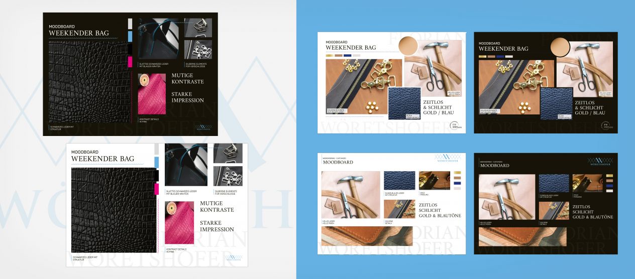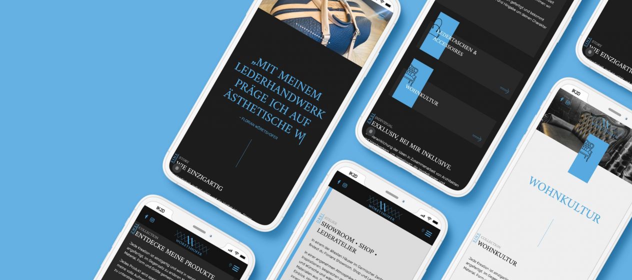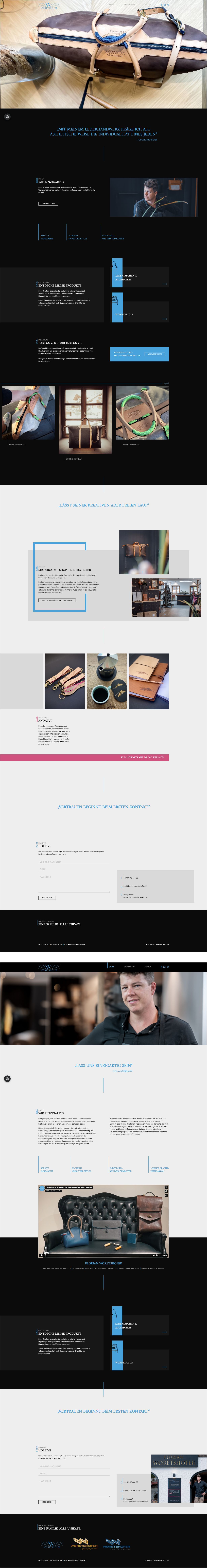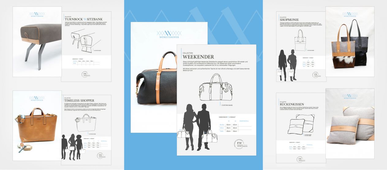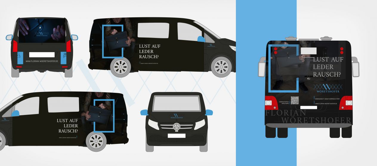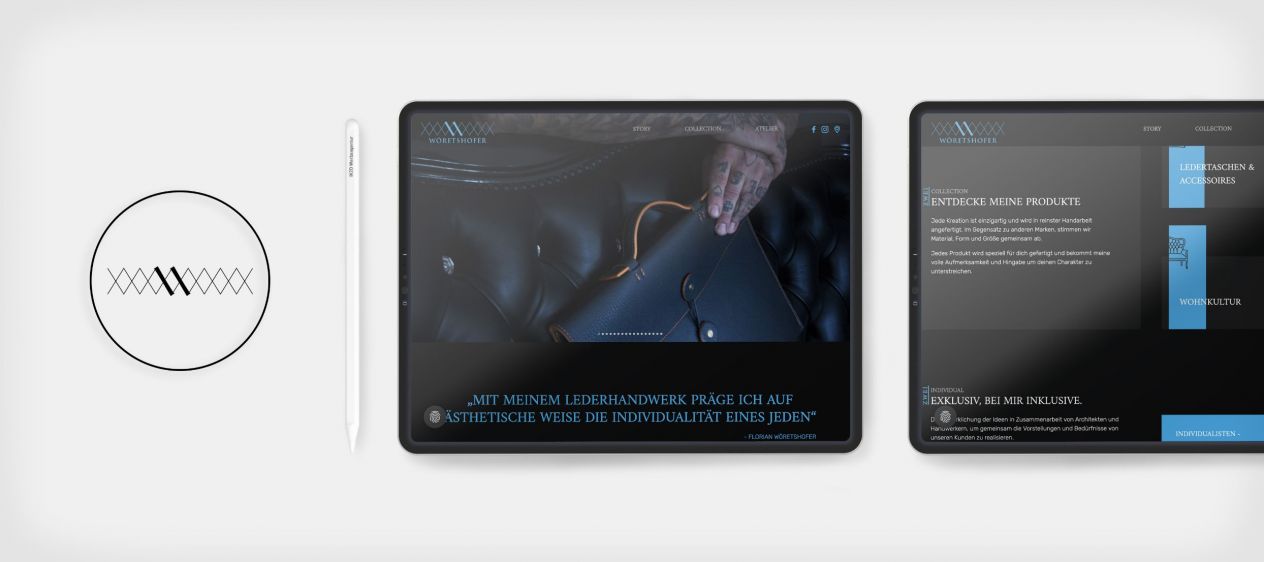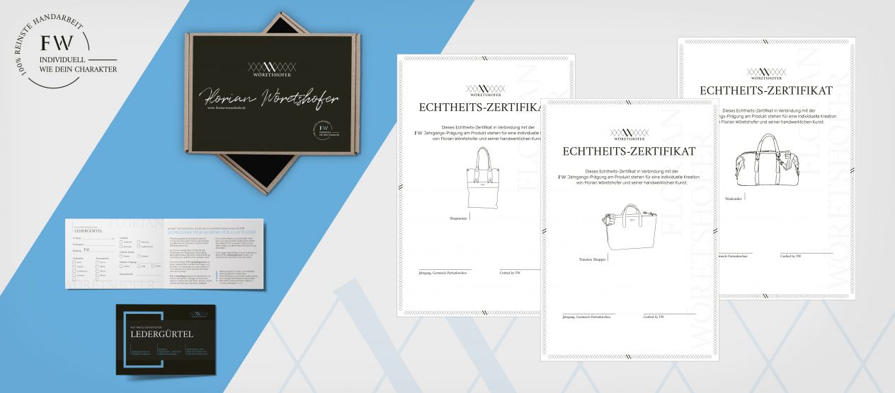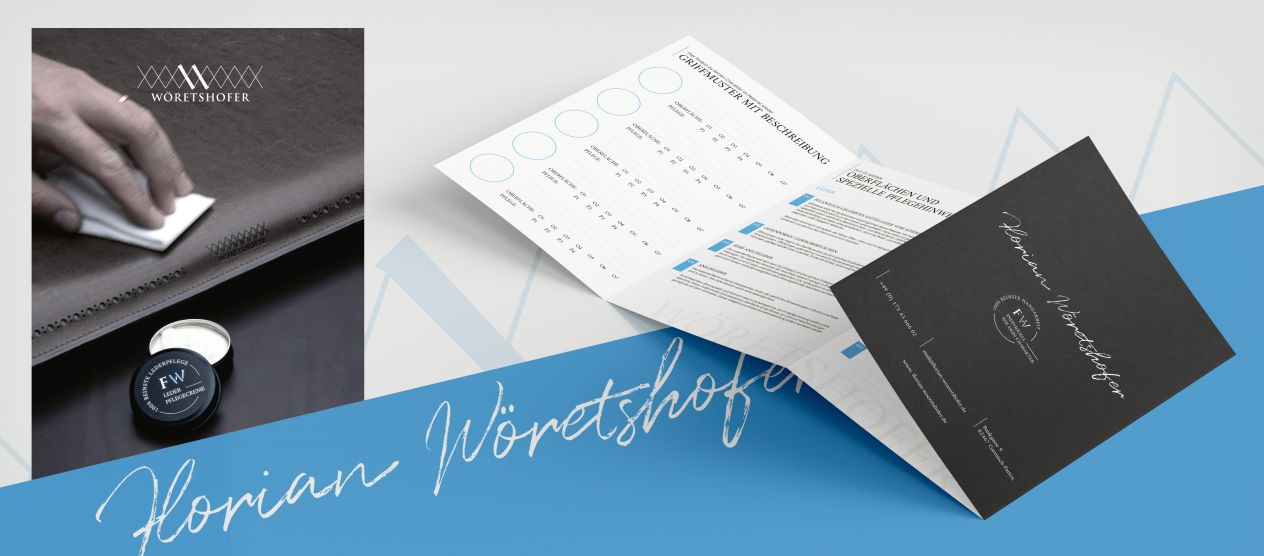Die Werbeprodukte und die Webseite von Florian Wörishofer sind genauso außergewöhnlich und exklusiv wie seine handgefertigten Lederwaren. Das Auftreten wird bewusst in einem unkonventionellen und auffälligen Stil gehalten, wobei die Farbe Schwarz anstelle von Weiß gewählt wurde, um einen markanten visuellen Eindruck zu erzeugen.